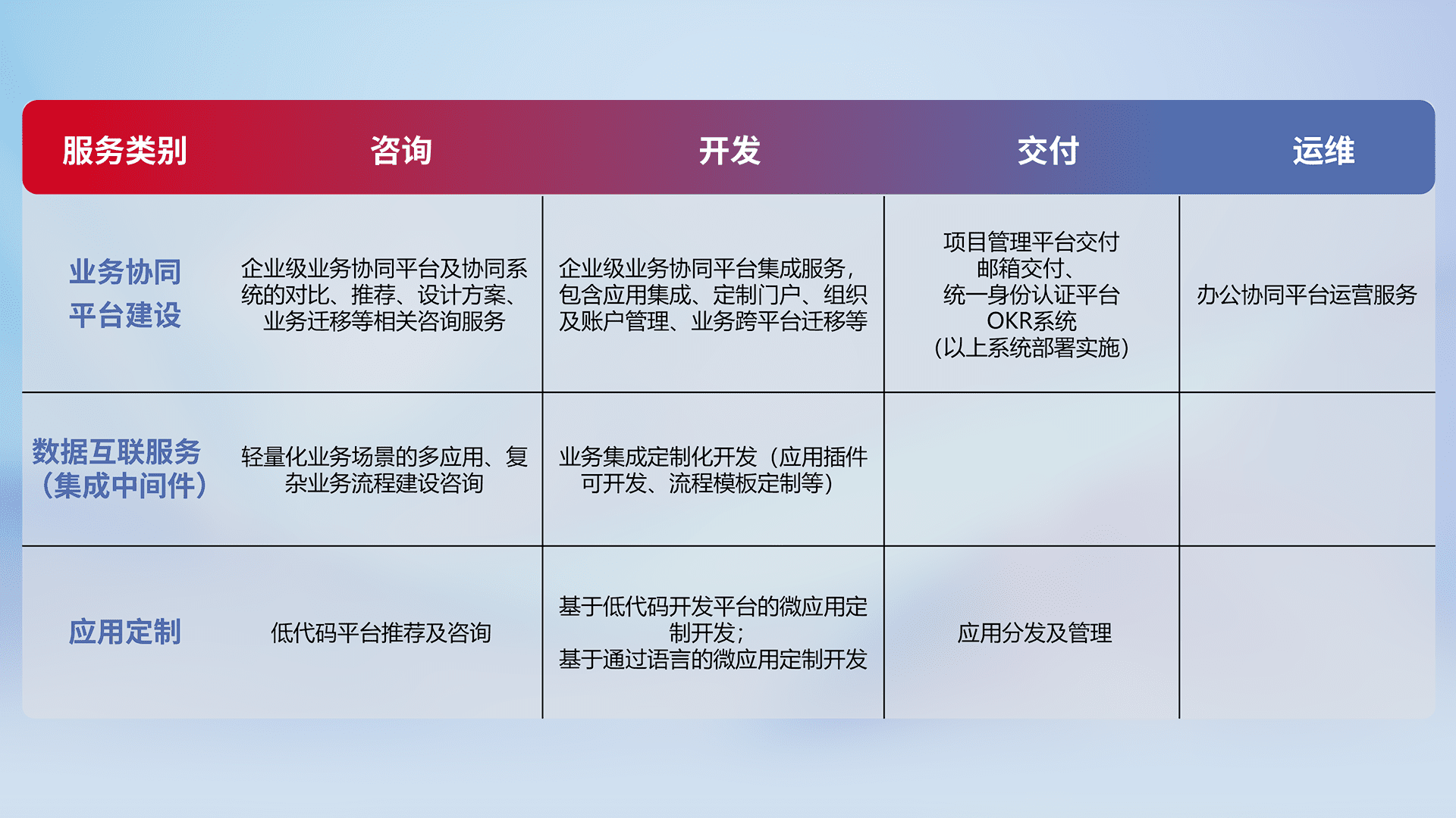 针对钉钉、、、、企微、、、、IDaas等平台级产品提供产品的规划、、、、方案、、、、交付、、定制化开发等服务,,,实现如统一协同办公、、智能客户服务、、、混合会议管理、、智能数据查询、、等业务场景,,,,实现数字化转型。。。